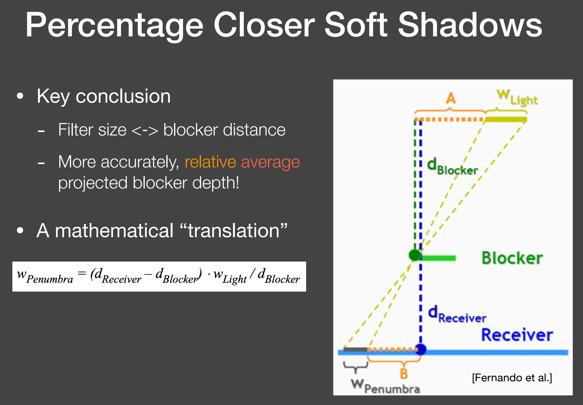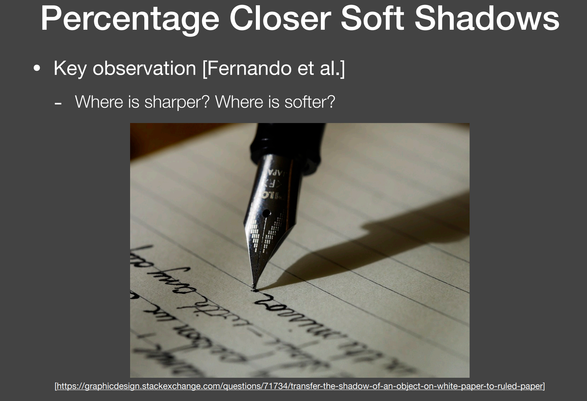 软阴影,思考之前那个半影的图,其实和阴影接受物的某个位置到阴影投射物的对应位置是近还是远有关。因此我们就想用根据这个距离值(我们叫做 blocker distance)来定义不同的 Filter size。这里的 Filter size 其实就是和 Wpenumbra 正相关的,例如 shading point 离 blocker 越近(例如上图的笔尖)阴影理应越硬,那么就不应该用很大的 Filter size(即 pcf 的搜索区域范围),而 Wpenumbra 越大则表示 shading point 离 blocker 越远,因此应该用很大的 Filter size