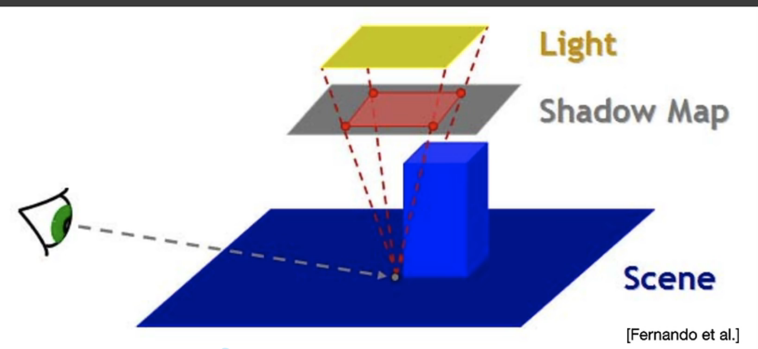 1. 从光源位置看向场景,渲染一张深度纹理(Shadow Map),记录每个像素的最小深度值(即光源到最近物体的距离)。