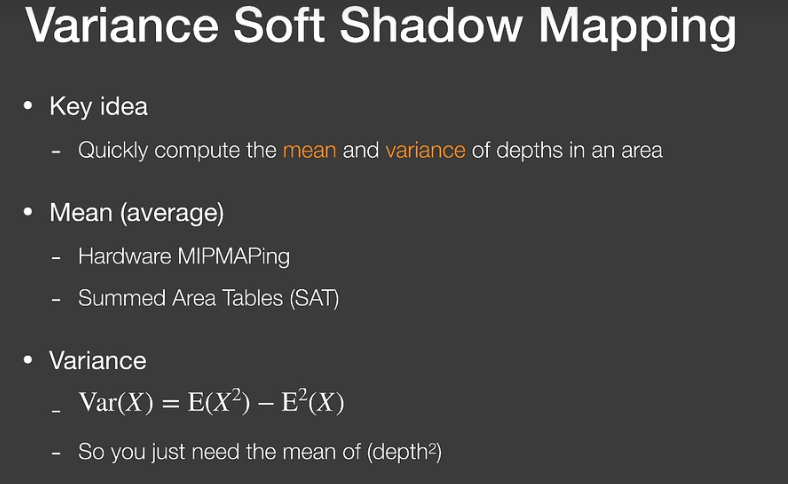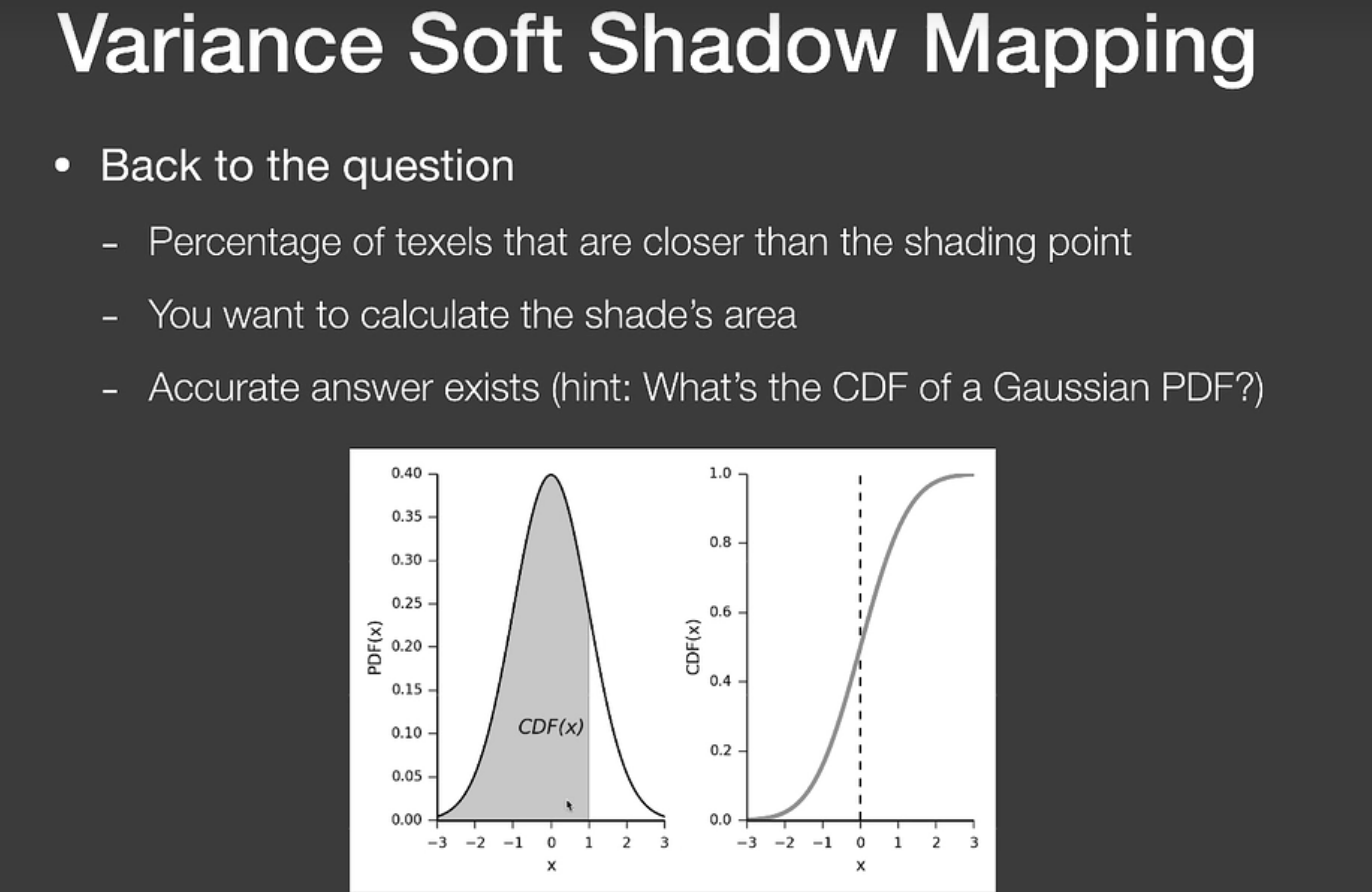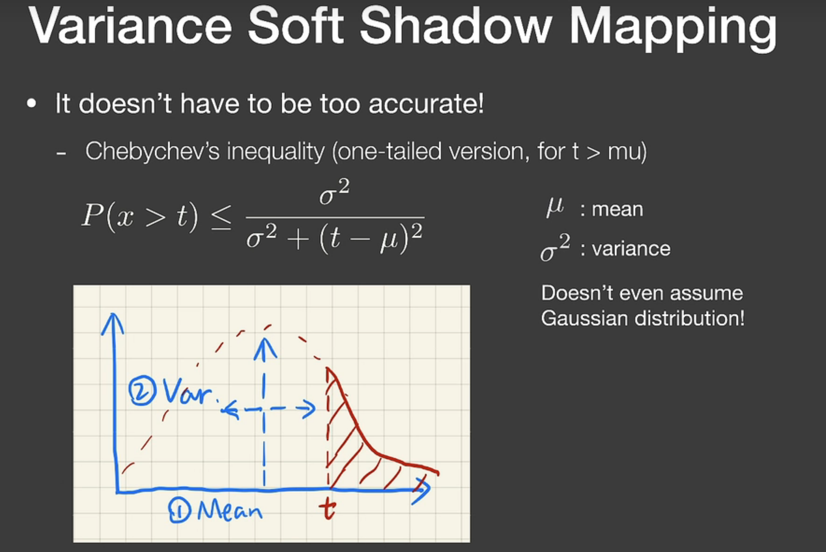 VSMM的思想是,我不需要那么精准的数据,我只需要大概知道我的 shading point 对应的 shadow map 那一段采样区域内的平均值大概排什么水平(之前PCF的时候说过shadow map一块区域都会和shading point的深度值进行非零即一的比较),我们直接假设这一段分布是正态分布的,要获得正态分布的曲线我们只需要求均值和方差即可。