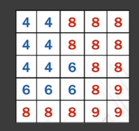 例子:shading point 深度为7,PCSS 第一步的范围为 5 * 5,这个shadow map在该范围内的深度值如下图: