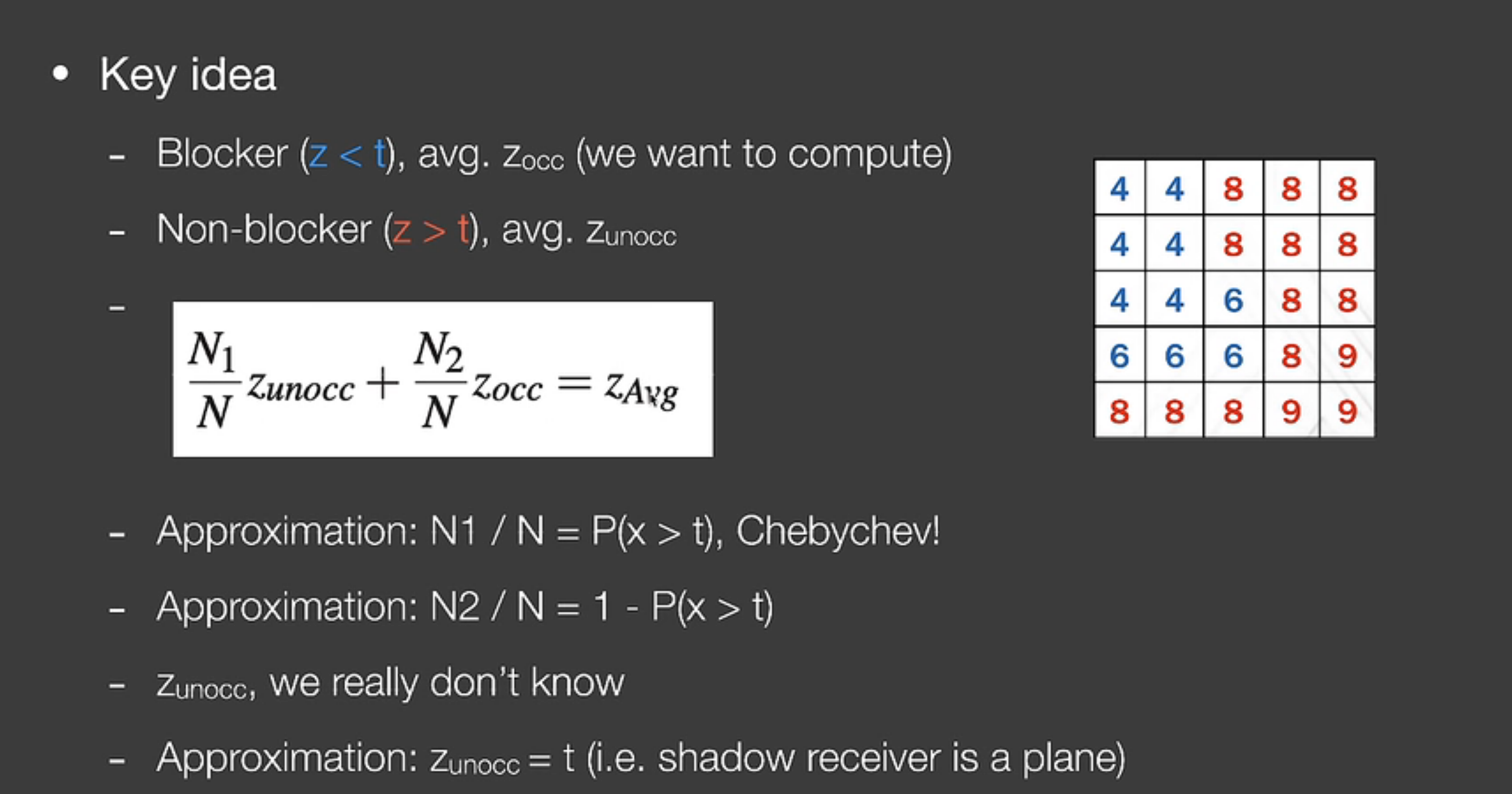 其实就是,PCSS第一步希望求 Zocc (即蓝色区域平均值),我们先假设 Zunocc 直接为 shading point 的深度值,然后通过该 5*5 矩阵的平均深度来计算出 Zocc,从而求出 PCSS 第一步的所需的那个 blocker distance (这样就避免了采样) - PCSS第二步,根据 blocker distance 计算出需要采样区域的大小(PCF 的 filter 的大小)。