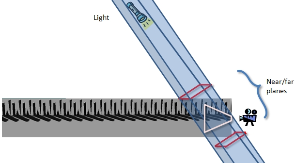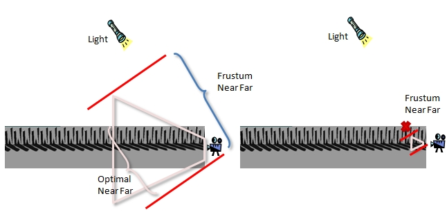 通常我们会将世界空间视锥的八个顶点,变换到光照空间,算出在光照空间下,最远和最近的z值,并计算出AABB边界。不过,这样也可能会造成另外一个问题,就是当摄影机的View Frustrum 很小时,造成计算出来的 light space frustrum 非常小,无法正确地投射所有需要投射阴影的物体:
