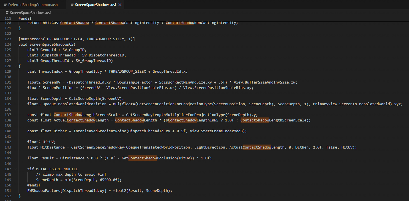 可以看到ue也是用 cs 来进行的,代码位于 ScreenSpaceShadows.usf 中