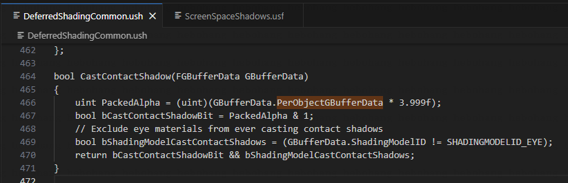 可以看到ue会判断当前像素是否要用 Contact Shadow(位于 DeferredShadingCommon.ush),所以 ue 会对一些物体有 Cast Contact Shadow 的开关。