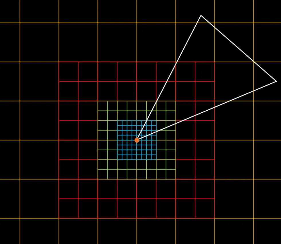 这里主要分析平行光的 Clipmap 形式,如下,中心为相机位置,白色为视锥范围: